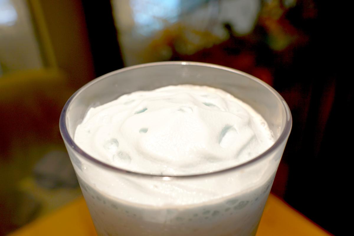 太いストローでカップのボールをカップの淵に追い込んで、ストローでガツッと力を加えます。あれ、あれれ?? ボールが逃げまわって、なかなか割れずにて手こずること1分…、やっと割れました♪(2杯目はあっさり割れました。個体差?慣れ??)