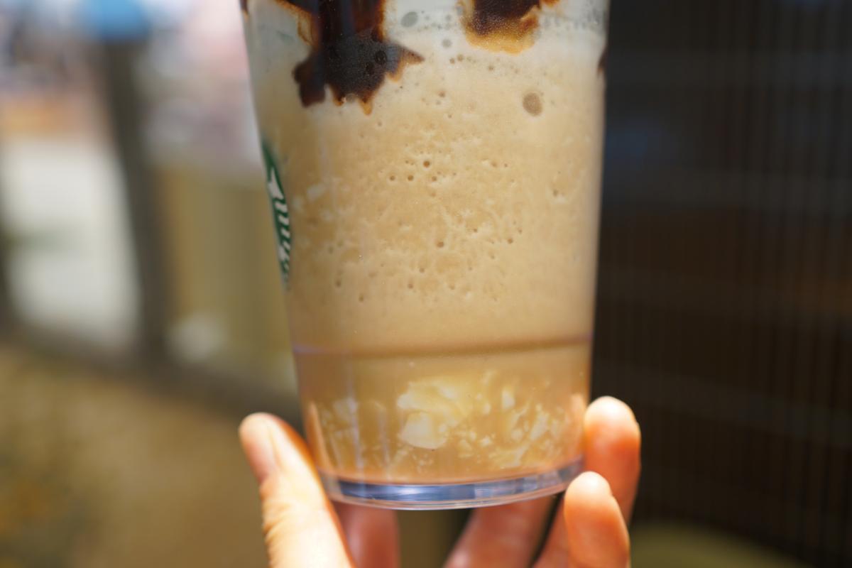 意外にあっさりとした後口の「春空 ミルクコーヒー フラペチーノ®」。キャラメルソースを追加(無料)して、コクのある甘さに。