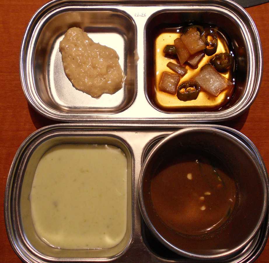 焼き上がった豚肉は「サムゴリプジュッカン」特製のソースにつけていただくのもポイント。ソースは、ガーリックマスタード(左上)、玉ねぎ唐辛子醤油(右上)、わさびクリームソース(左下)、アンチョビソース(右下)の4種類です(わさびクリームソースのみ期間限定)。