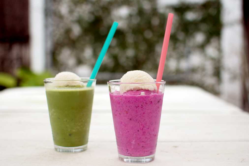 ショップには、沖縄の旬の瓶詰めを使ったお食事やドリンクが楽しめるカフェ「cafe 'eju'」も併設。こちらはドラゴンフルーツと抹茶のソルベール。自然のままの色味なのに、とってもビビットでフォトジェニック。ドリンク以外にも卵や牛乳を使っていないパンケーキや自家製ジェラートのパフェも!