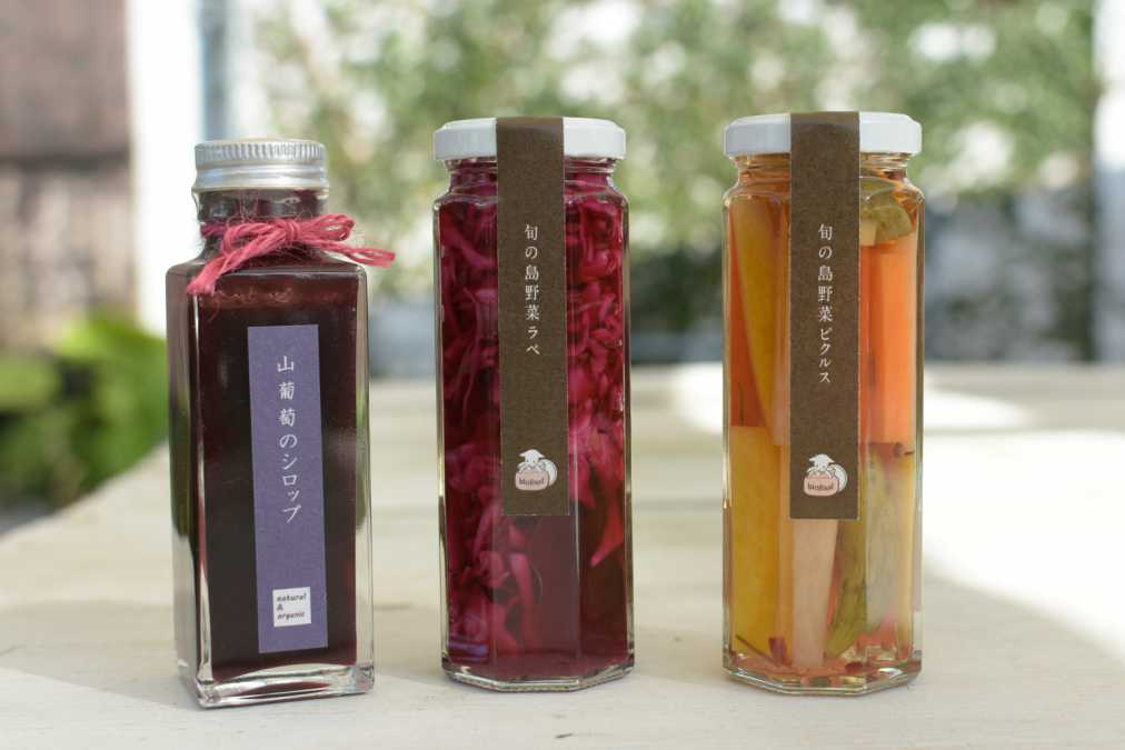こちらは沖縄在来種の山葡萄のシロップと、旬の島野菜のラペとピクルス。 山葡萄は無農薬で自然のままに育てたものをひとつひとつ丁寧に下処理し、沖縄奄美産のきび砂糖で煮詰めたもの。季節限定の瓶詰めです。