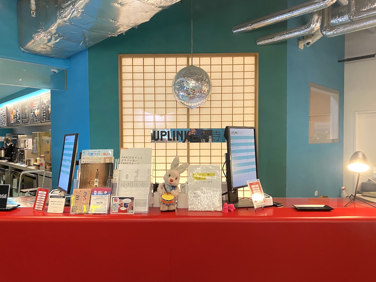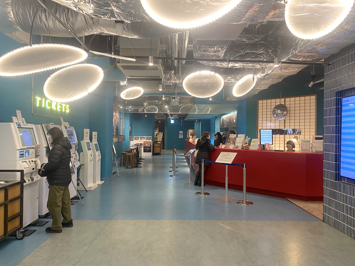 館内には吉祥寺パルコ内のエレベーターまたは、エスカレーターを利用して入ることができます。その先のロビーに広がっているのはターコイズブルーを基調とした空間。受付の後ろにあるミラーボールと障子の組み合わせなどがニューレトロな雰囲気を漂わせています。