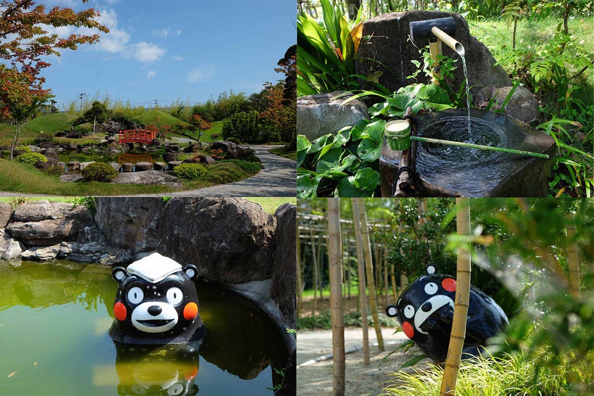 本格的な日本庭園やししおどしなど、海外からの観光客を想定した和の趣が随所にちりばめられています。そこにはお風呂に浸かっているくまモンや竹林に隠れているくまモンも。