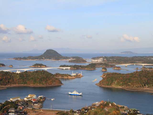 ドライブコースとして有名な「天草五橋(あまくさごきょう)」は、三角から大矢野島、永浦島、大池島、前島を経て天草上島までにかけられた5本の橋のこと。3号橋から4号橋へと至る周辺の道路は、海面に近く透明度の高い海を楽しみながらドライブができます。松が生い茂る小島が点在し、ここでしか見られない特別な景色は旅のよい思い出に。
