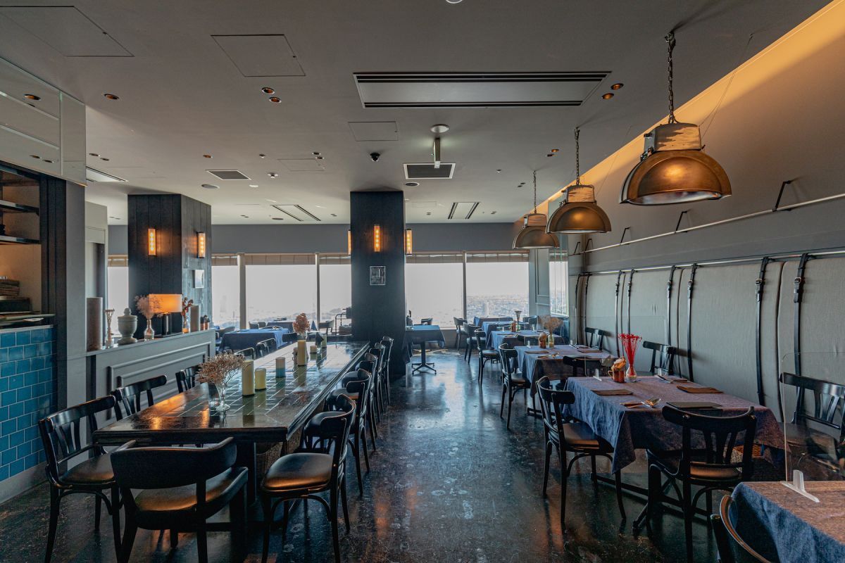 南フランスを中心にフランス各地の郷土料理を手がけるレストラン「ROTISSERIE★BLUE(ろてぃさりー ぶるー)」。恵比寿ガーデンプレイスタワーにあるお店は、壁一面に大きな窓があり開放的な空間になっています。「BLUE」という店名らしくタイルやテーブルクロスに青色が使われ、その青が映えるようグレーや黒を基調にしたフレンチシックなインテリアがおしゃれ。テーブルクロスにはデニム調の生地を取り入れるなど、落ち着いたなかにもカジュアルさがあり、心地いい雰囲気が漂っています。