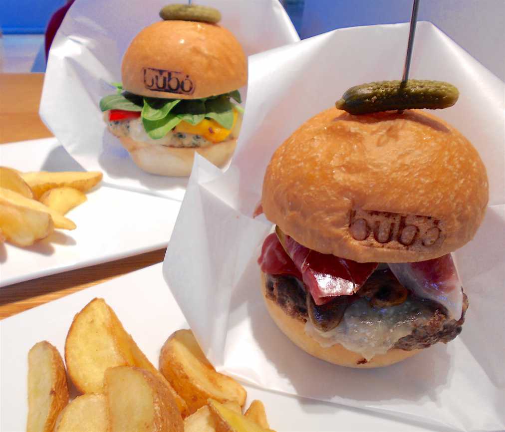 2階のカフェではオリジナルハンバーガーも提供しています。種類は肉厚のビーフパティ―に、生ハム、チーズ、オニオンなどを挟んだ「ブボバーガー」(写真手前・1512円)と、粗挽き肉を使ったチキンパティに、ホウレンソウやパプリカを挟んだ「チキンバーガー」(写真奥・1296円)の2種類。