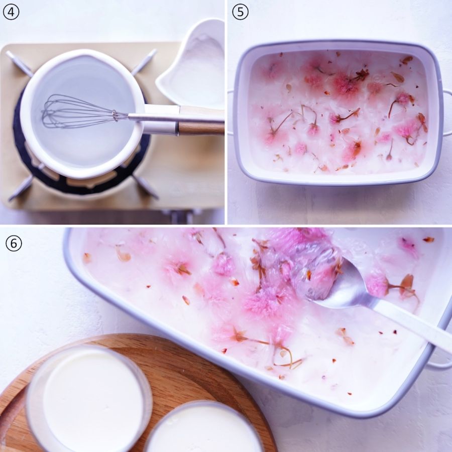 ⑥どちらとも固まれば、杏仁豆腐に、桜のジュレを流し入れます。