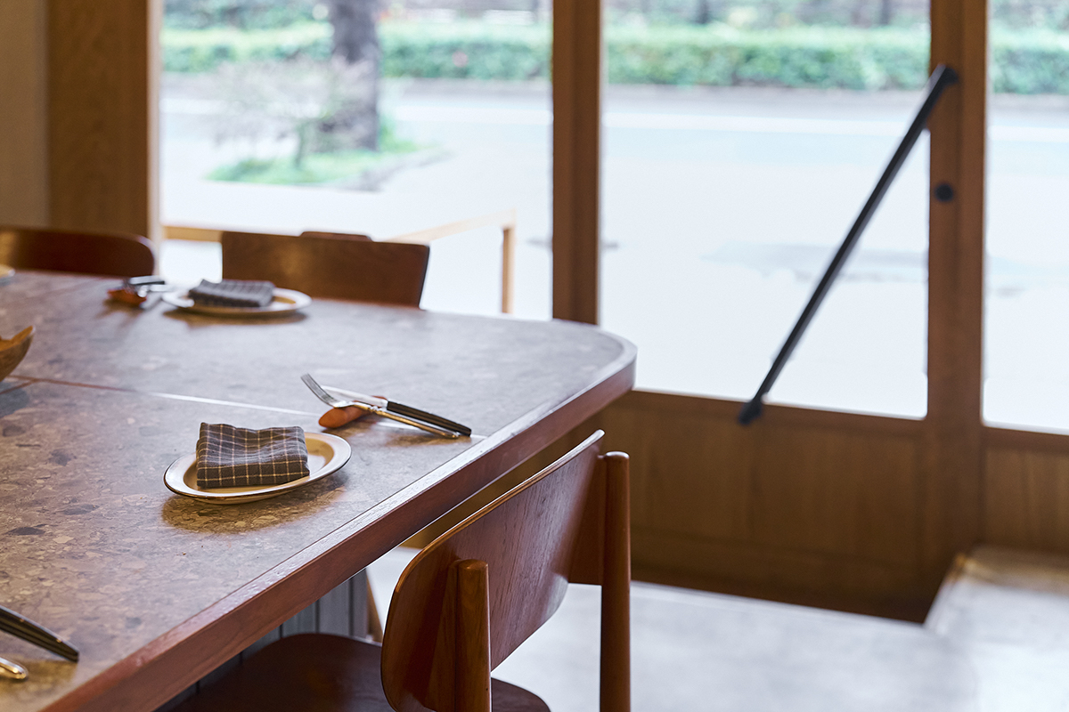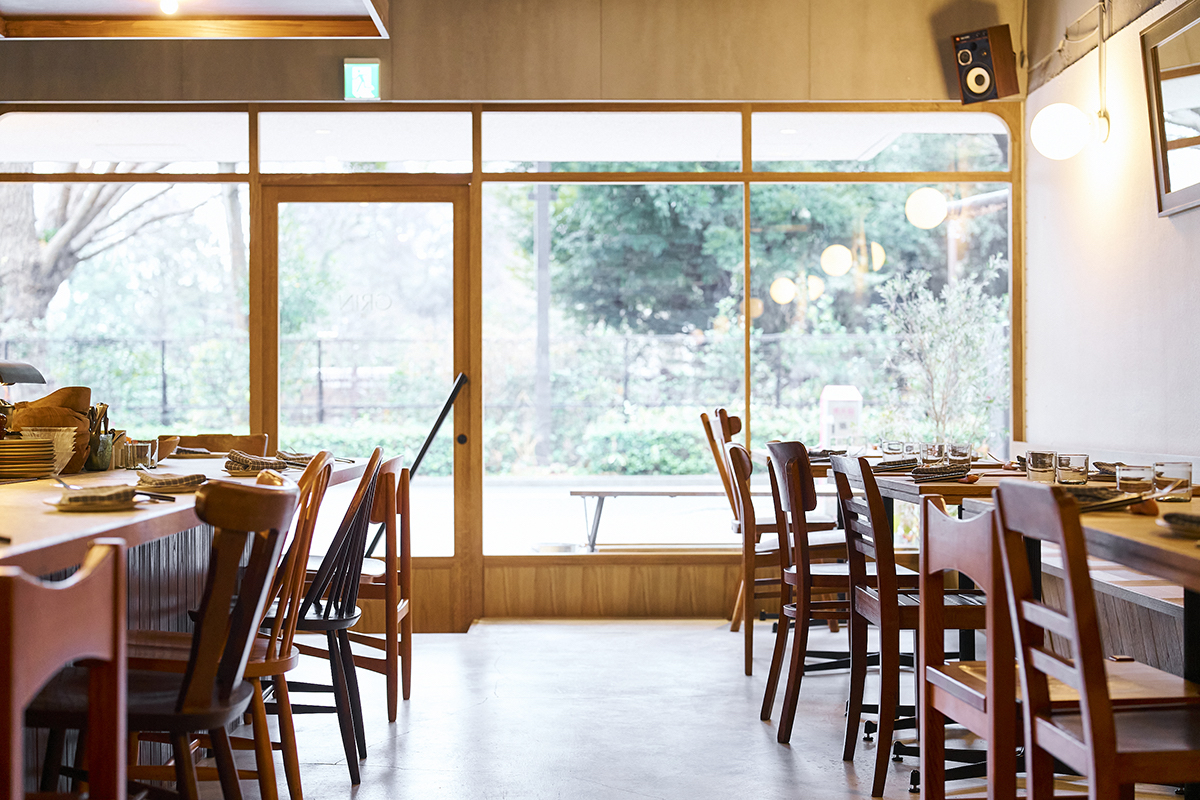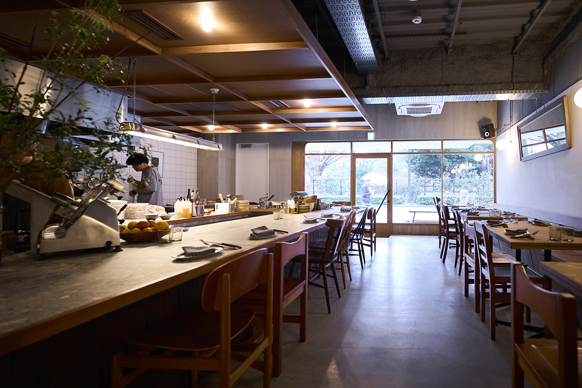 店の内装は、人気の飲食店やホテルなどの空間デザインを数多く手がける設計事務所「SAWS inc.」によるもの。もとは駐車場であったという物件の無機質な魅力を生かしつつも、木の温もりを感じられるモダンな空間に仕上がりました。身を置いているだけで心地よく、気持ちがおだやかに。平日は夜のみの営業ですが、土・日曜、祝日はランチタイムの営業もしています。