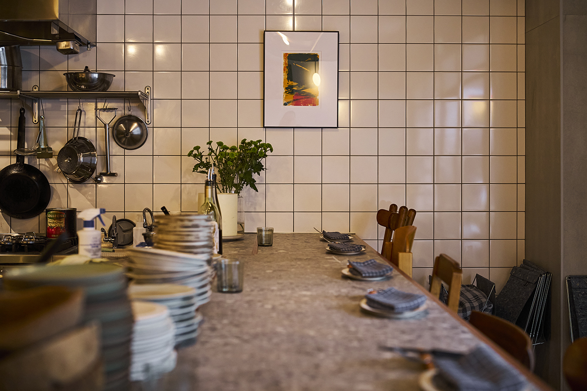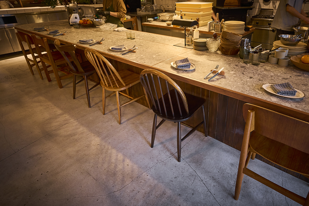 さりげなく置かれたキッチンツールや器にも細やかなこだわりやデザイン性があり、店内の整然とした雰囲気を作り出しています。
