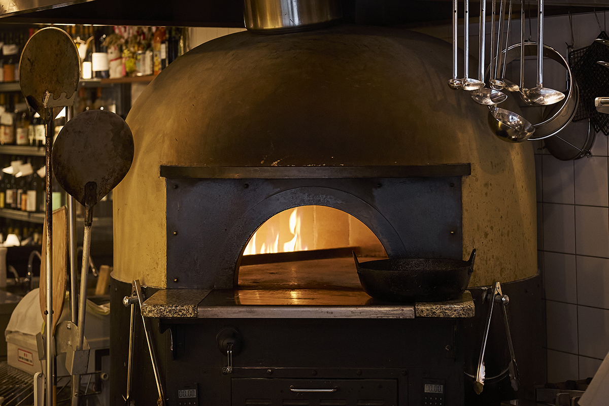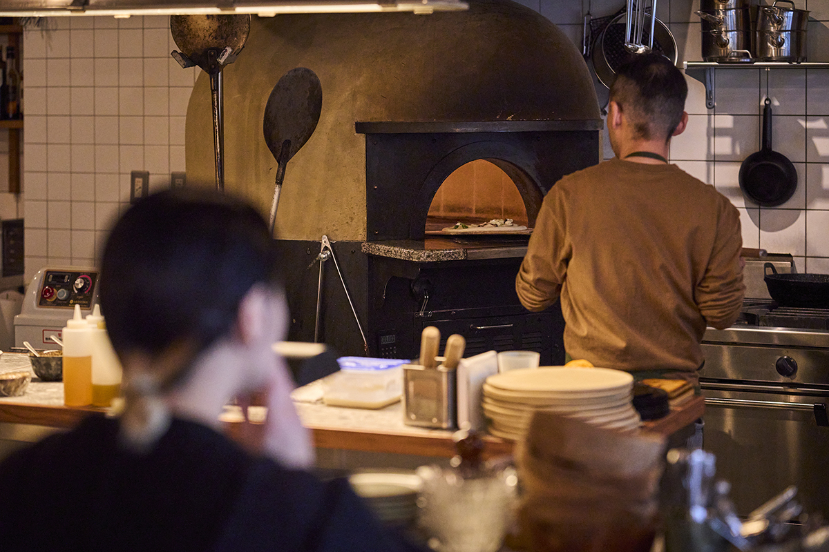 キッチン奥にある大きなピザ窯の炎は、まるで暖炉のよう。取材当日はどんよりとした雨模様でしたが、窓に反射するピザ窯の炎のゆらぎを見ることができて、逆に「雨の日に来てよかった」と思えるほどの雰囲気のよさでした。