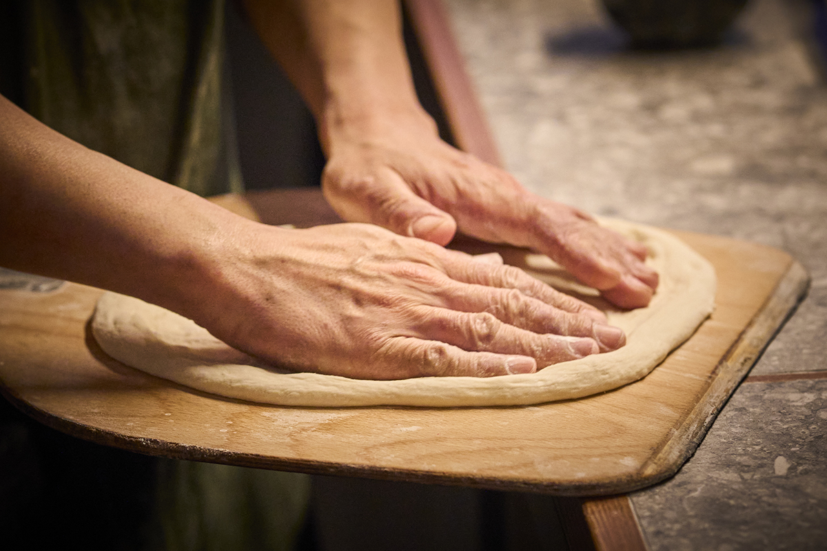 ピザ生地は、オーダーが入ってから手早くこねられます。「GRIN」のピザの特徴は、モチモチともサクサクとも言いがたいちょうどいい軽やかな新食感。この食感は、ピザ生地にできるだけ必要な空気を残しつつこねているからだとか。国産小麦の粉を使用し、「エンボカ」のレシピの配合をそのまま継承しています。発酵の際は外気の温度や湿度の影響を受けやすいため、その都度塩梅を見つつ調整をし、提供時に一番おいしい状態になるようにこだわっているそうです。
