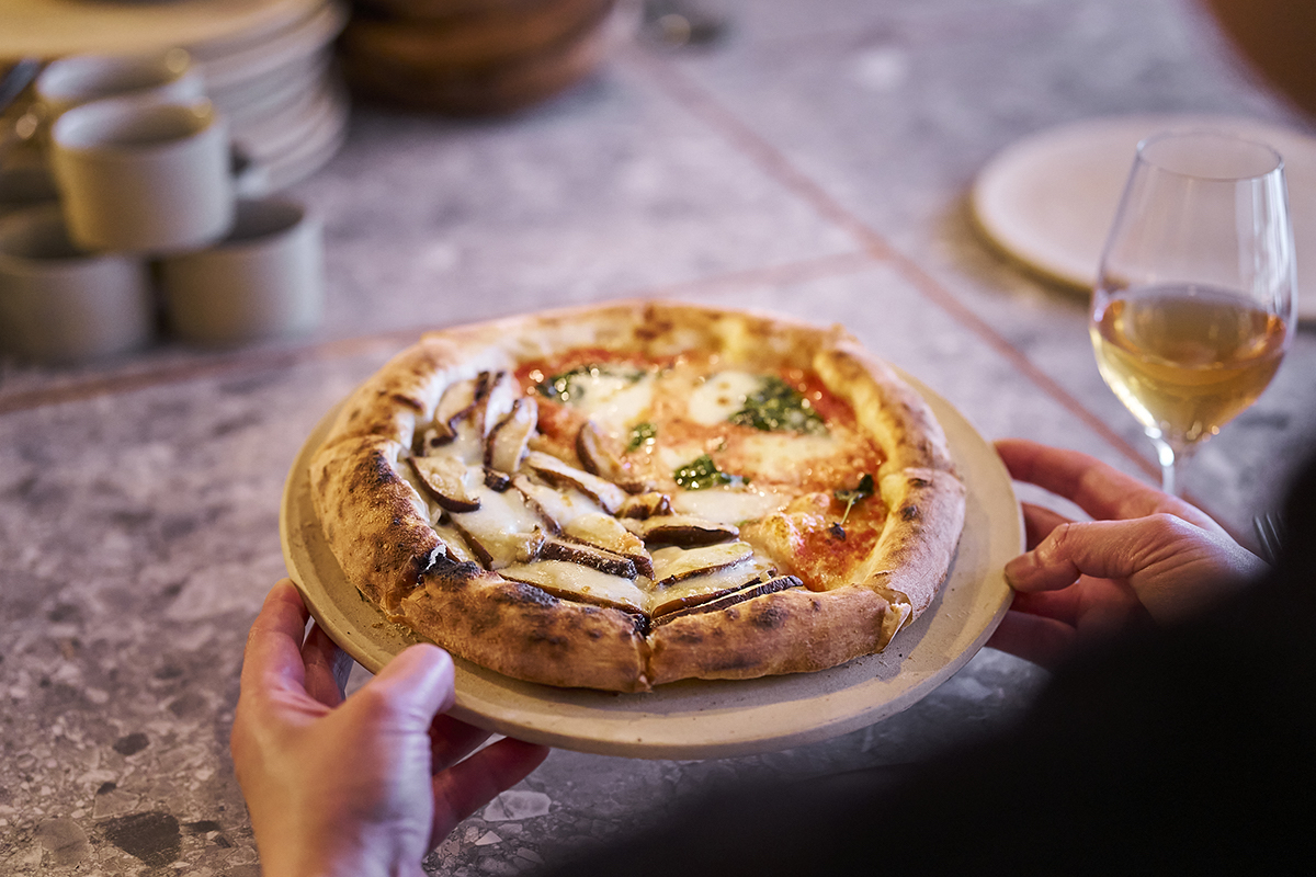 今回オーダーしたのは、人気の「マルゲリータとしいたけのハーフ&ハーフ」2800円。定番のピザ「マルゲリータ」「クワトロフォルマッジ」「しいたけ」と季節限定のもので常時6種類ほどあるピザは、ハーフ&ハーフでのオーダーも可能。ひとりでも2種類の味を楽しめるとあって、飽きずに食べ進められそうです。