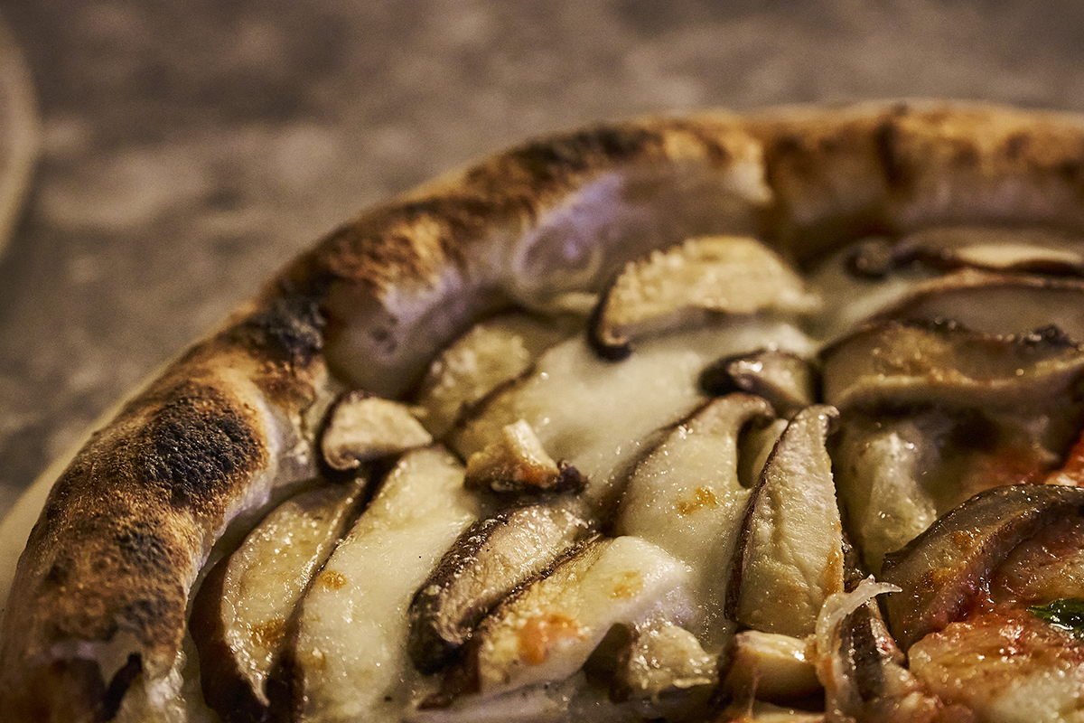 次に「しいたけ」。「しいたけ」のピザで使われているシイタケは、徳島県上勝町(かみかつちょう)から直送されたものだそう。ピザのベースには、発酵したマイタケをペースト状にしたものが塗り込まれています。塩などで味付けはせず、シイタケ、チーズ、オリーブオイルのみを使用。素材の味を生かした味わいです。