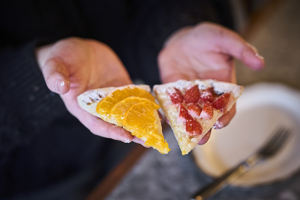 イチゴの甘酸っぱさとピザの薄い生地が絶妙なハーモニーを奏でる「イチゴ」と、酸味がフレッシュに口のなかに広がる「オレンジ」。2種類を一度に味わえるって、やっぱりこのうえない幸せです。みずみずしいフルーツとクリスピーなピザ生地の対比がたまりません。温かいフルーツって、おいしい。やみつきになりそうです。