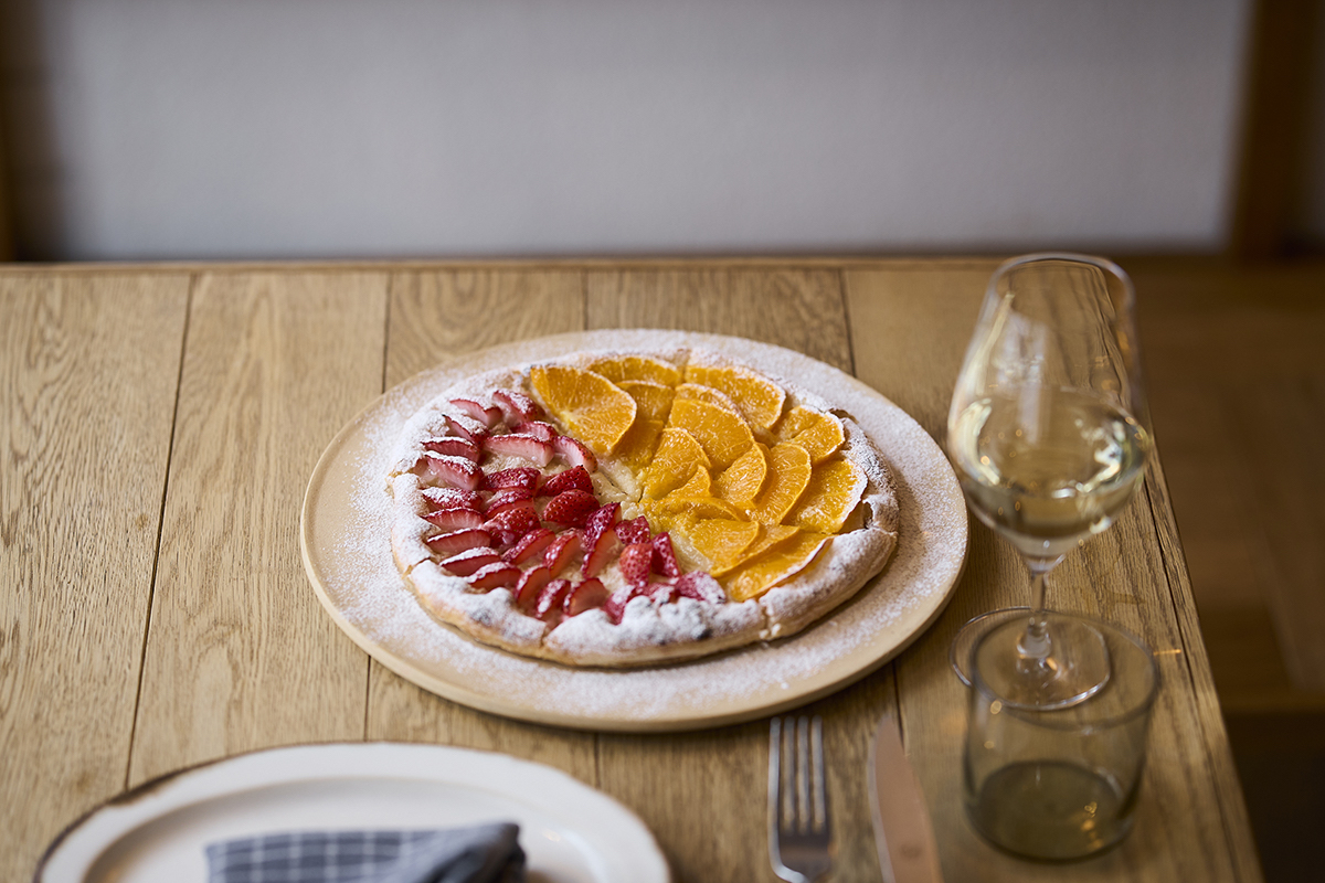 「GRIN」のもう一つの推しピザが、こちらの「デザートピザ」。季節のフルーツがふんだんにのせられています(フルーツ変更は不定期)。食事系のピザと同じ生地を使っていますが、耳の部分が分厚くなりすぎないように成形されているというこだわり。食事系のピザがなるべく温度の高いところで一気に焼き上げられるのに対し、ピザ窯の中の温度が低めの場所でゆっくりと焼き上げられるのがデザートピザ。そうすることで、フルーツのジューシーさを残しています。
