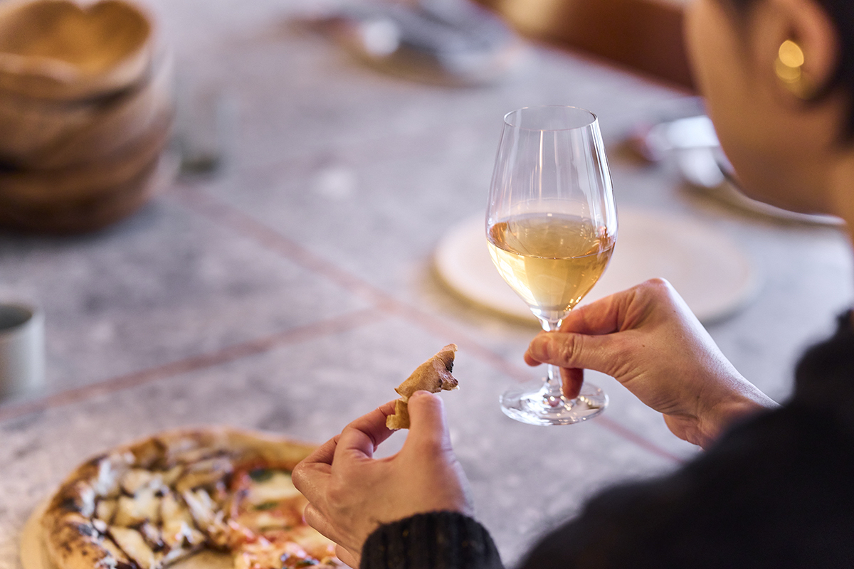 見るからに肉厚なシイタケは、口にいれるとうま味たっぷり。もちもちとした具材とサクサクのピザ生地は相性抜群です。チーズとの黄金の組み合わせを、ワインで流し込む……。幸せなひとり時間です。