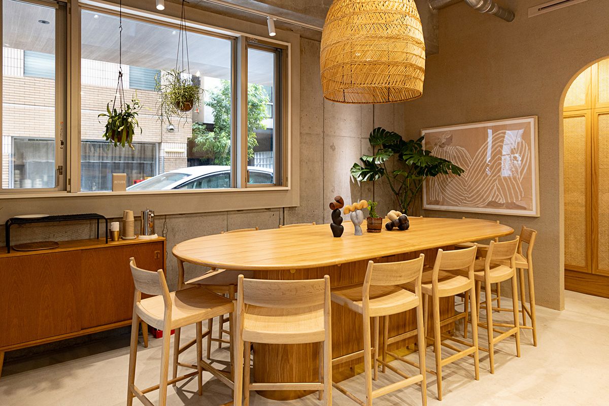 蔵前駅から徒歩10分ほど歩くと見えてくる、開放的な入り口。「ICHIBIKO蔵前店」の内装はこれまでのICHIBIKOとはまた雰囲気が異なり、建材やインテリアの素材感を大切にしつつ、より洗練された印象に仕上げたのだとか。打ちっぱなし壁やむきだしの天井の無機質さとナチュラルさが共存した空間です。