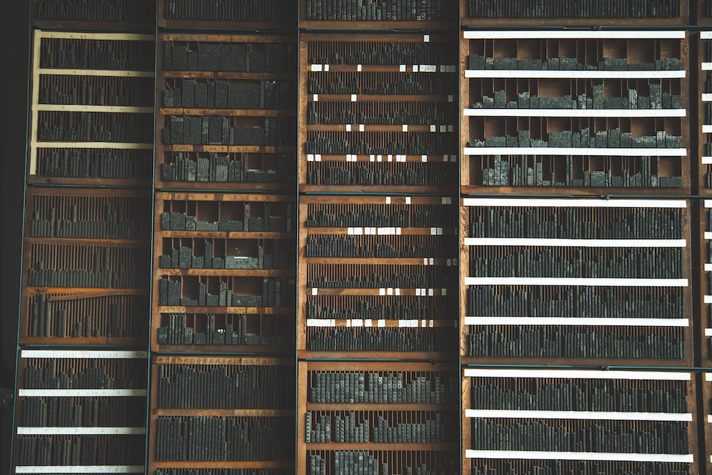 文字が並ぶ活字棚。この中から必要な文字を拾って組んでいたと思うと、驚き! それぞれサイズや書体違いなど、数えきれないほどの活字がずらりと並びます。