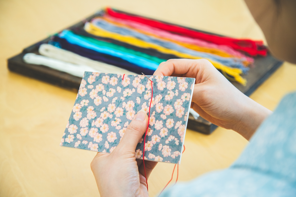 好きな柄を選んで、糸でかがるだけ。ハガキサイズのノートを作れるお手軽メニュー!