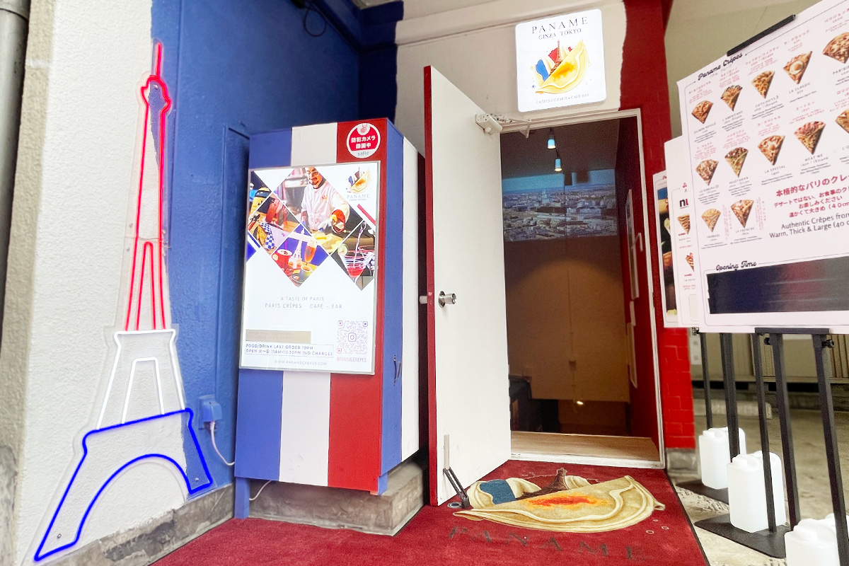 JR新橋駅から徒歩約7分、御門通りに面する「PANAME Crêpes de Paris」。エッフェル塔のパネルがお出迎えしてくれる、愛らしい店構えです。