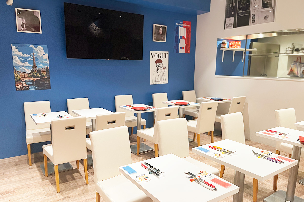 店内はトリコロールカラーで統一され、銀座の街角から一気にパリのムードに引き込まれます。