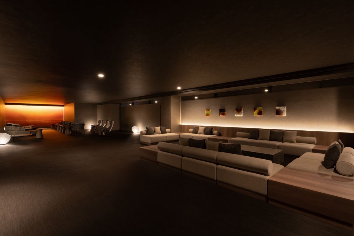 間接照明にほんのりと照らされ、落ち着いた雰囲気の「温泉ラウンジ」も。湯上り後はドリンク片手にひと休みしてみて。