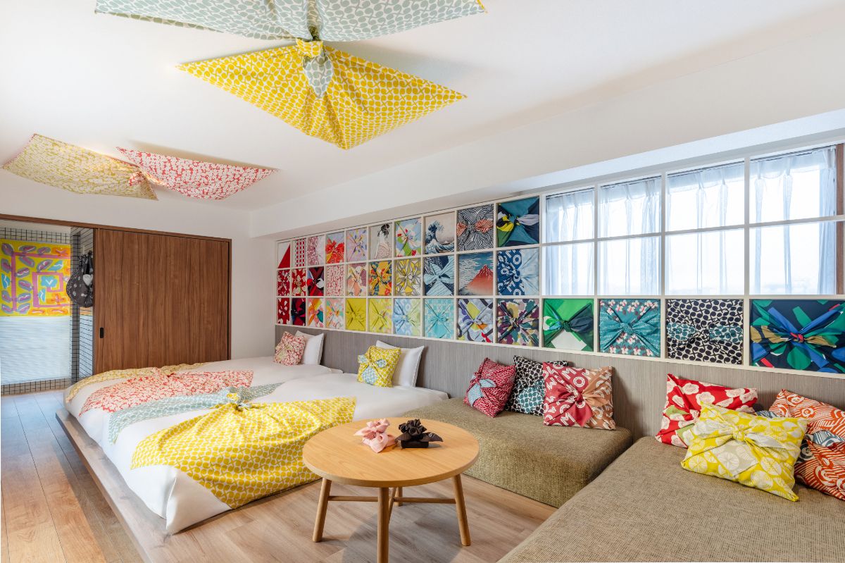 お友達やファミリーで旅先でもおしゃべりが弾む、団らんテーブルを備えたスーペリアルームを、天井はもちろん壁一面に、大きさや柄がさまざまなふろしきを散りばめ、色鮮やかな空間に。