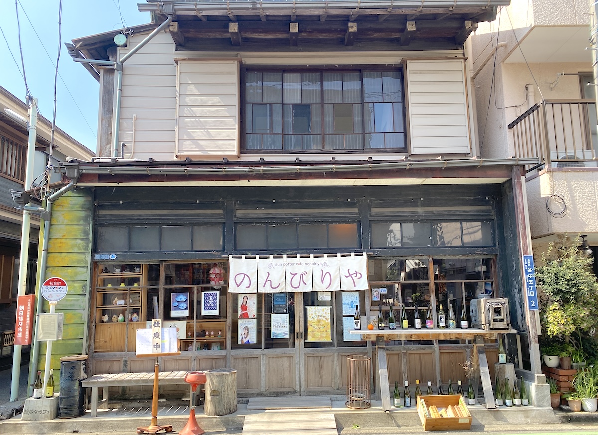 JR日暮里駅南口から徒歩約7分、閑静な住宅街にあるのが「散ポタカフェのんびりや」。大正時代に建てられた町屋を改装したカフェで、ノスタルジーを感じる門構えと白いのれんが目印です。