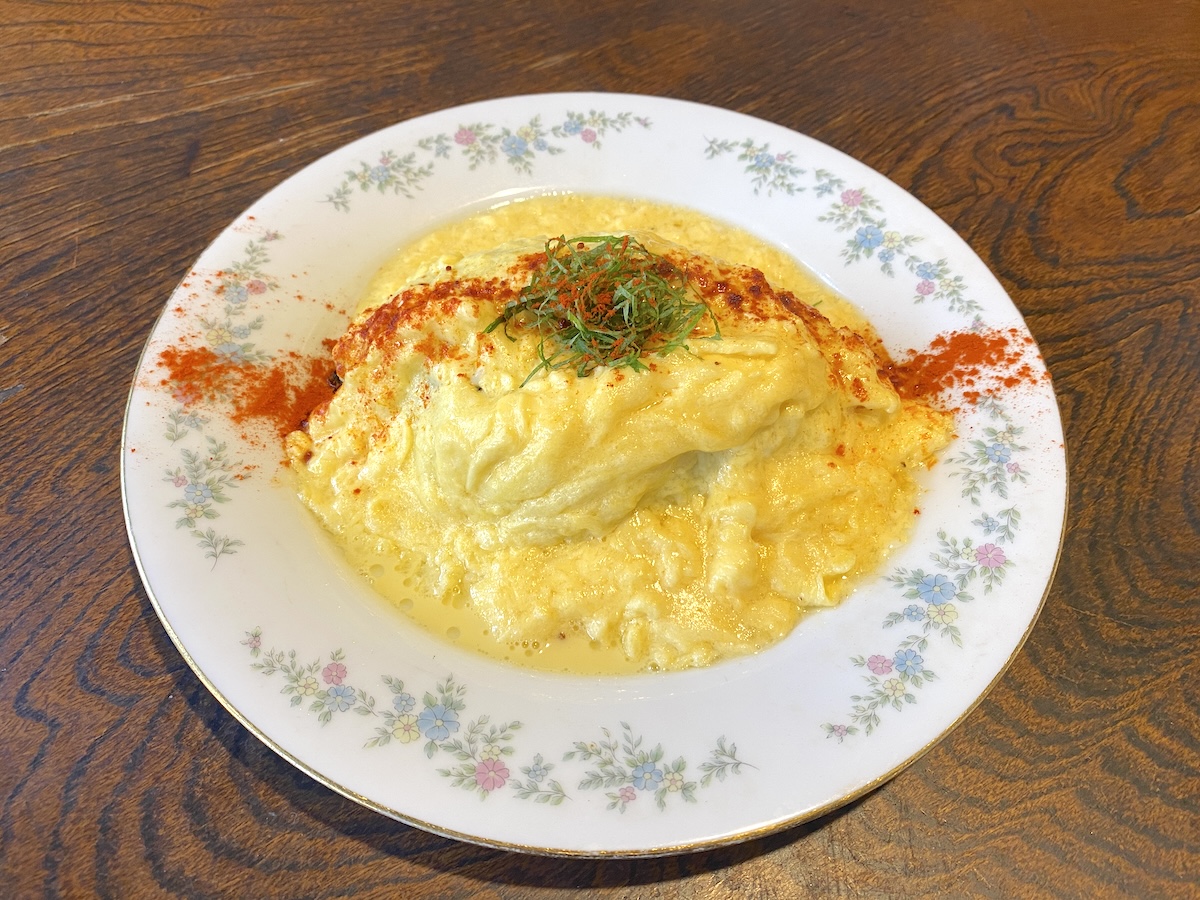 この独特なオムライスが生まれたきっかけは、常連さんの無茶振りとのこと。イカスミパスタがメニューにあった当時、黒いチャーハンを作ってほしいというリクエストがあり、試してみたもののすべて真っ黒でイマイチな出来栄え。色味を足そうとタマゴをのせてみた結果、名物オムライスが誕生したそう!
