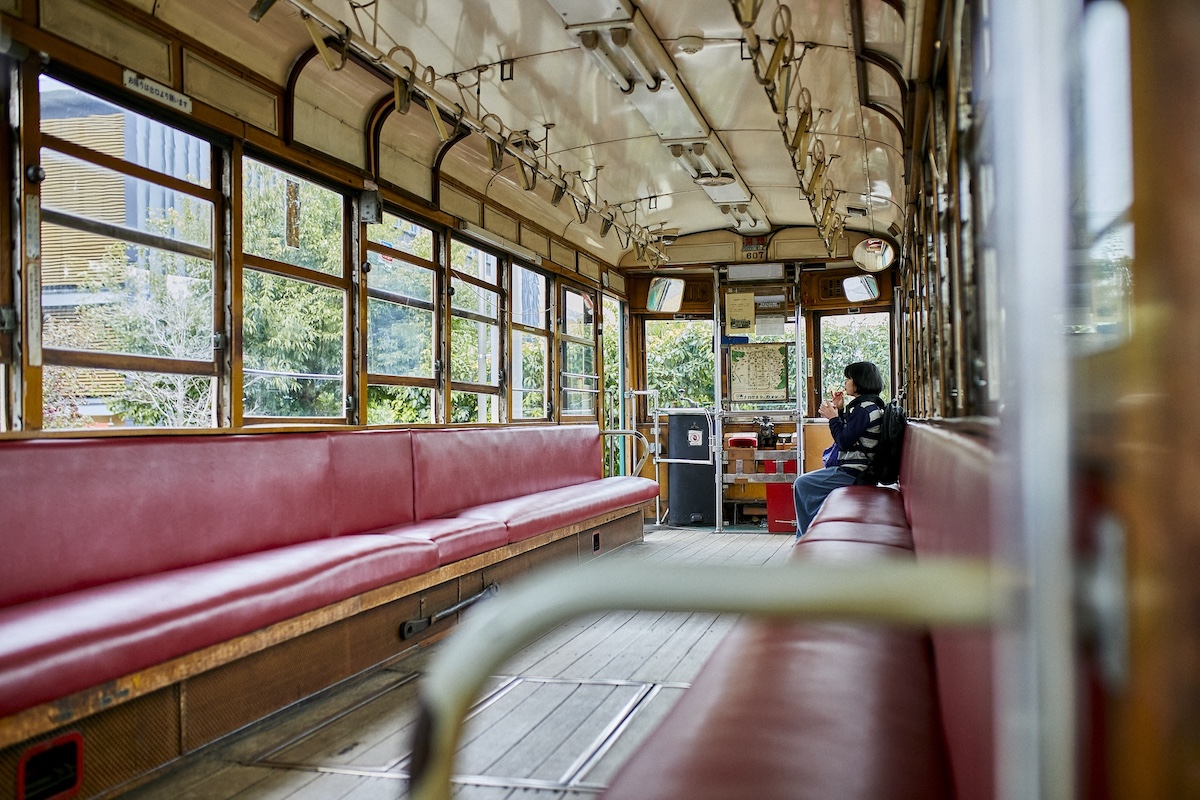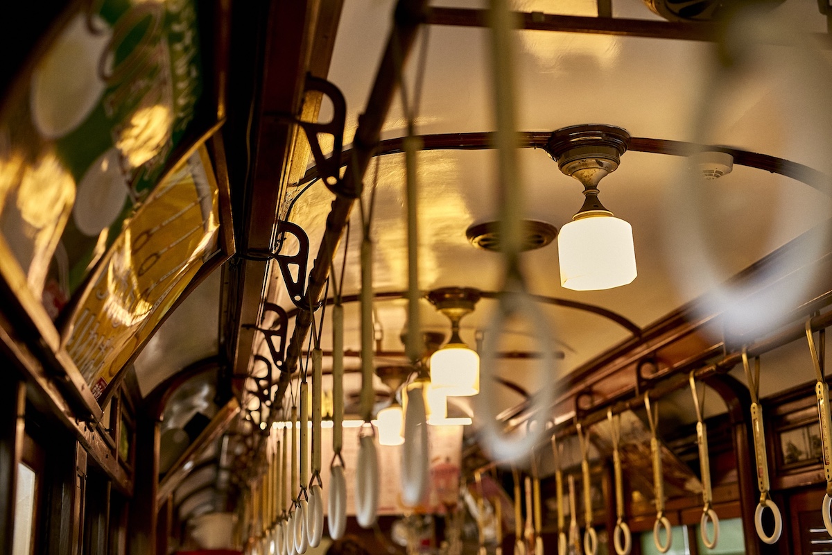 曲線状の天井やビロードの椅子、木製の床はもちろんレトロな照明も大正時代に作られたままの姿をそのまま生かしています。今となっては考えられませんが、昔の人たちは木造の電車に乗って通勤や通学をしていたのですね……。