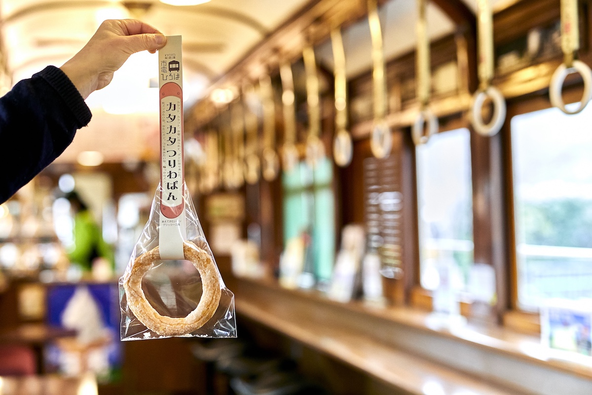 揺れる電車の音とかじったときの硬い食感をかけたネーミングの「カタカタつりかわぱん」。おみやげにもいいですね。レトロな車内で写真を撮るととってもフォトジェニック。