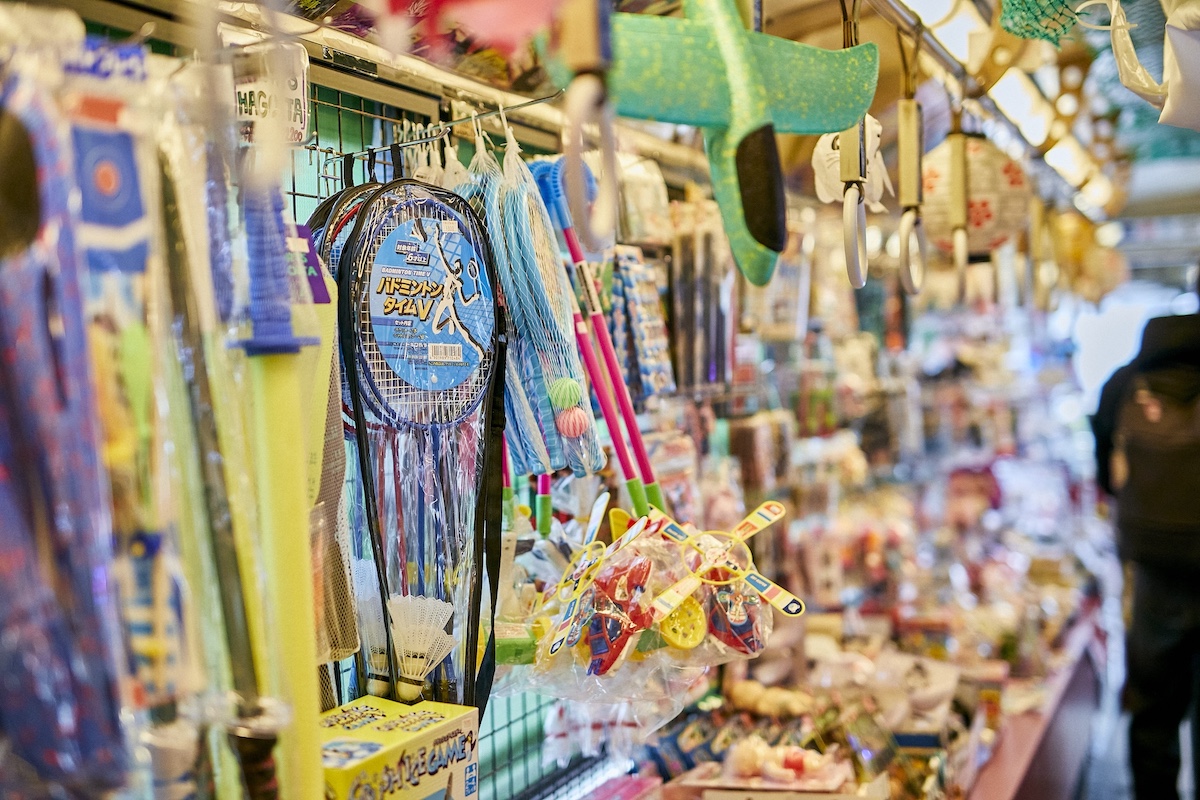 車内の左右にぎっしりと、しかもさまざまな種類のおもちゃがあります。一般的なおもちゃ売り場ではなかなか見かけないような珍しいものが予想よりも安く売られていてついつい夢中に。