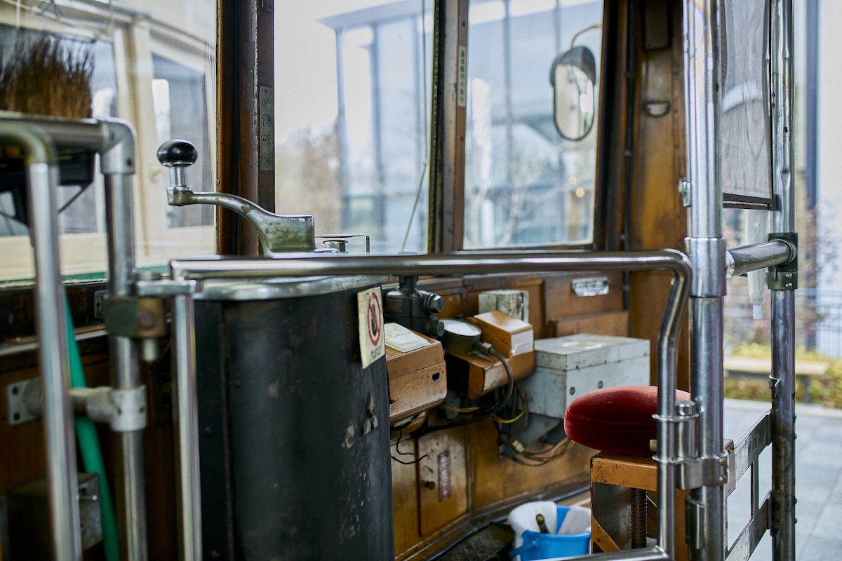 手で回すタイプのブレーキや当時車掌さんが座っていたであろう別珍張りの丸椅子などが保存状態よく残っています。