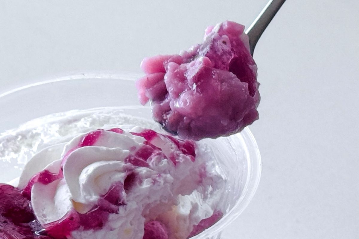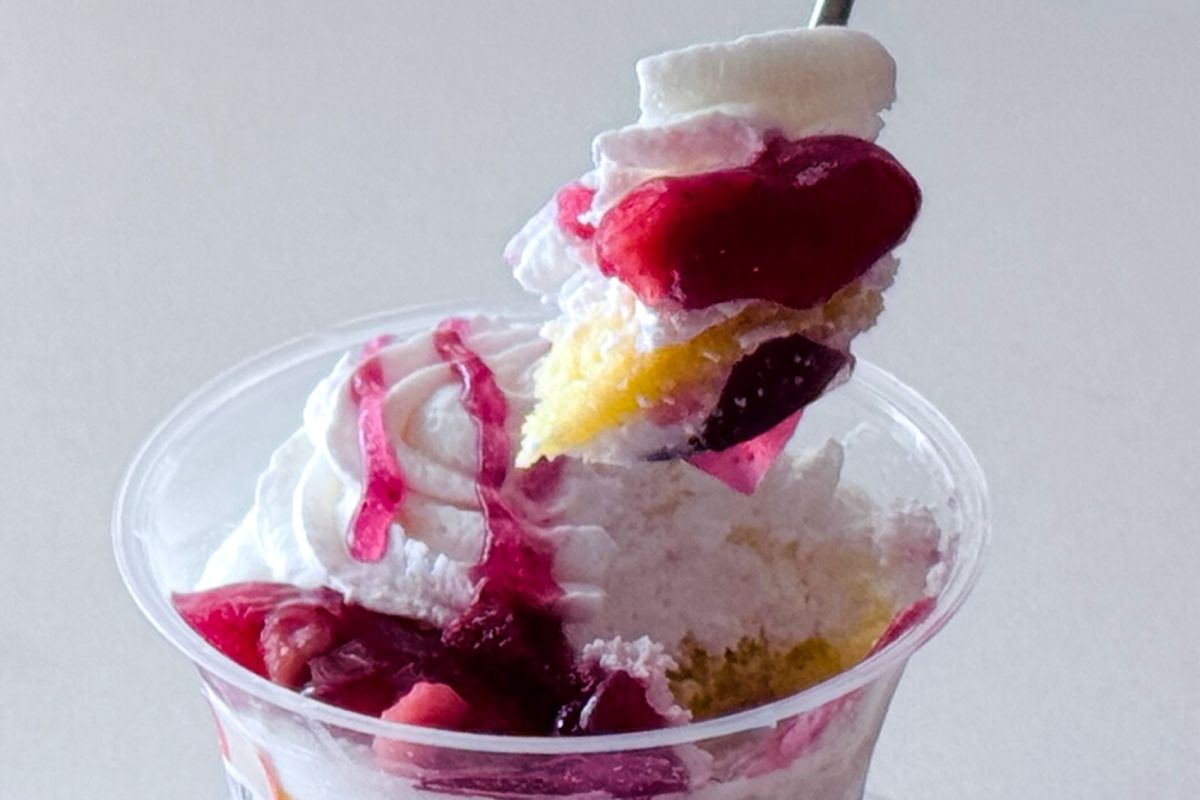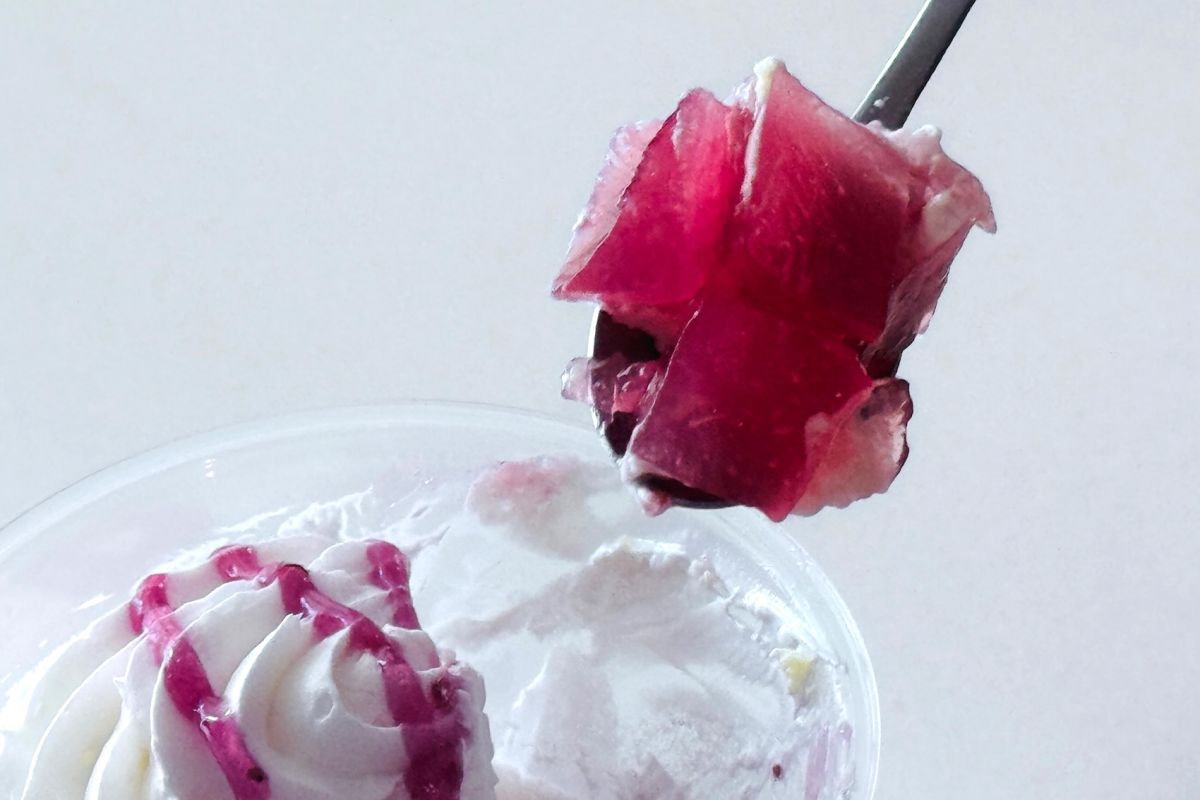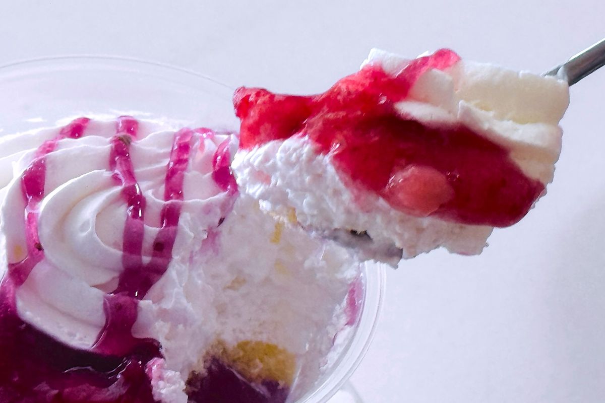 カップの蓋を取ると、改めて、こんもりと厚みのあるホイップクリームのボリューム感がせまります。白いクリームと果肉の入った赤いいちごソースのコントラストが、とってもきれいです!