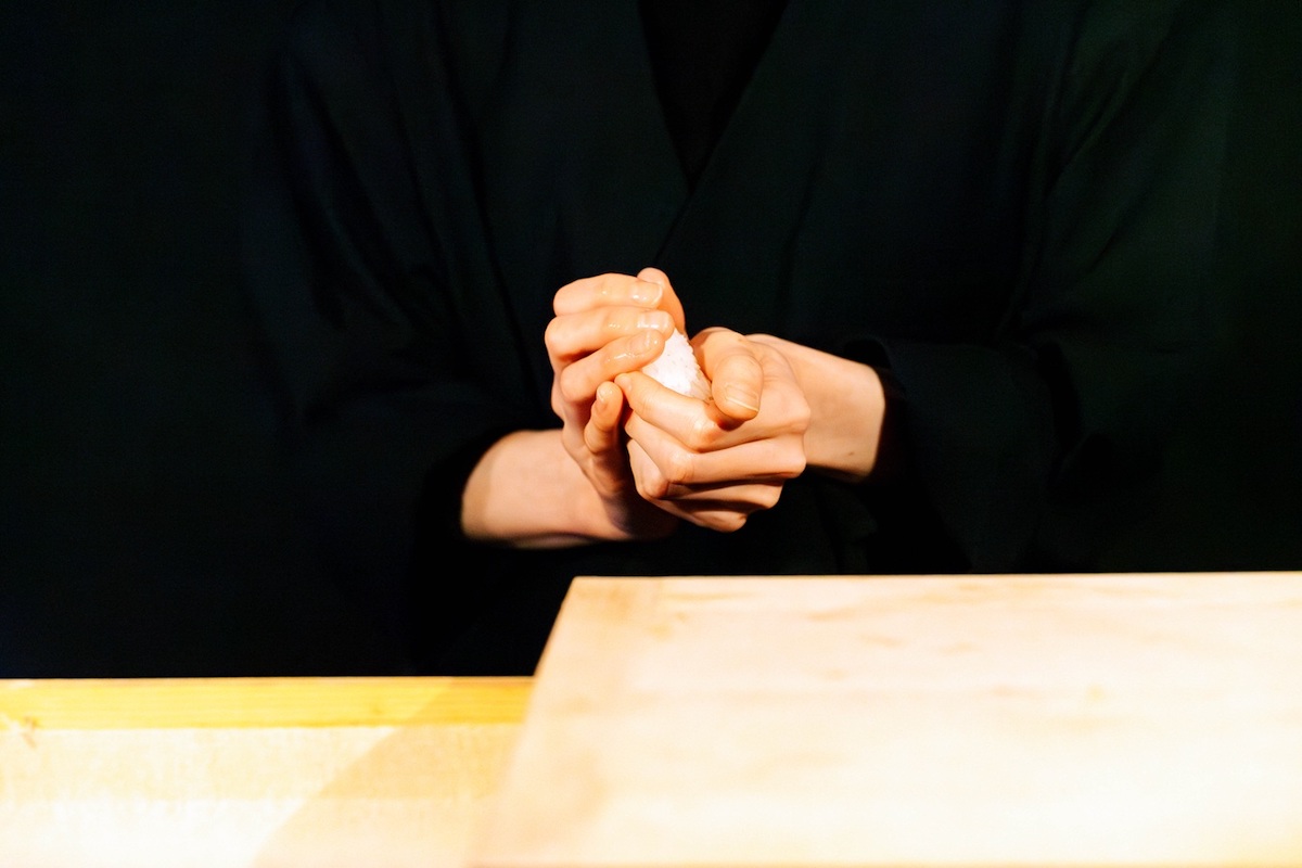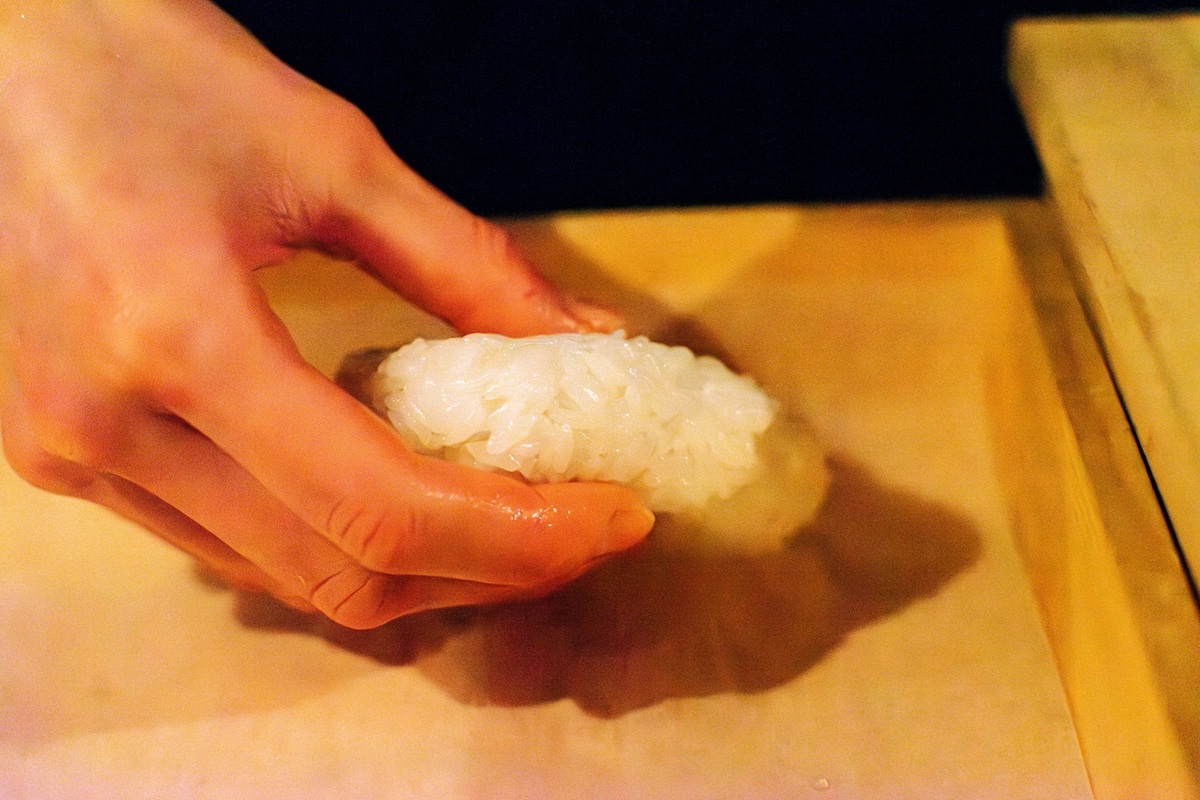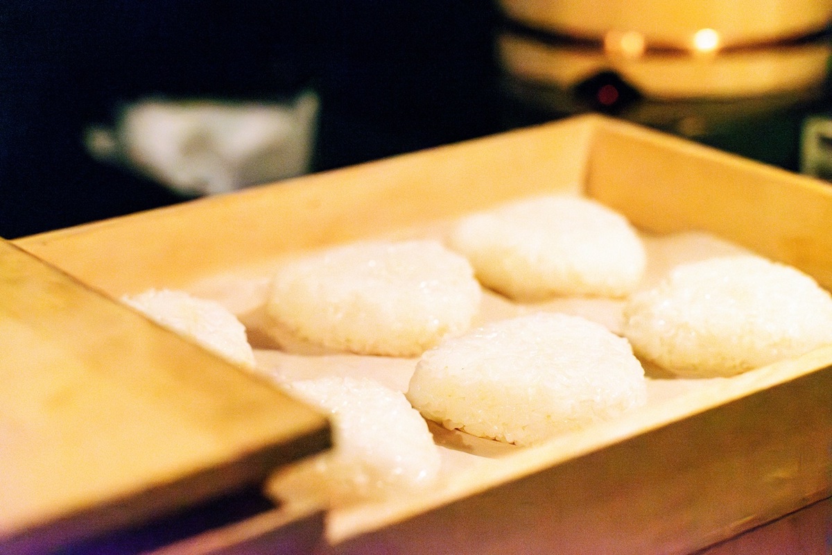 成形後すぐに提供するのではなく、まずは木箱に入れてひと休み。人肌程度まで放熱することで、この後に巻くのりのパリッとした食感を最大限に生かします。少し平らに成形しているのも、放熱しやすくするため。