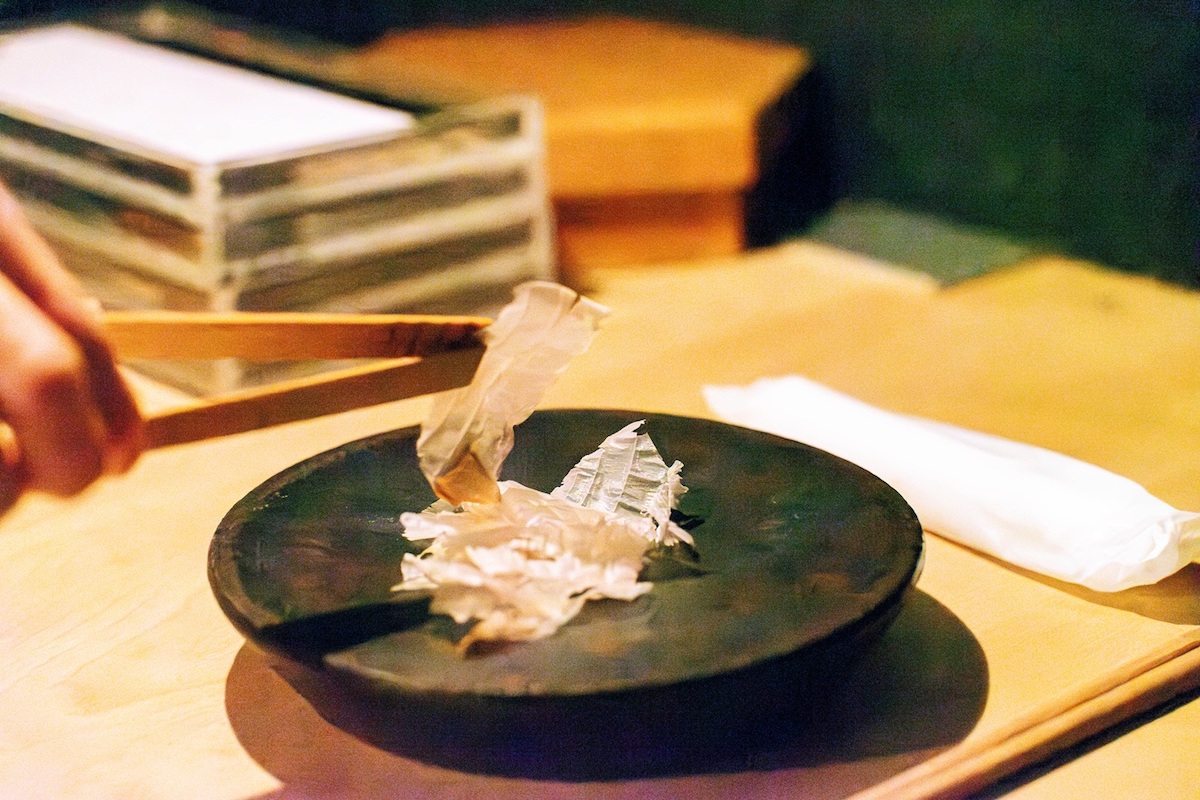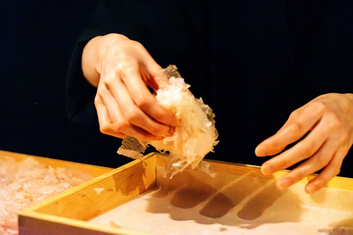 待っている間、おにぎりに使う本枯れ節を少しつまませていただきました。鹿児島県指宿産の一本釣りカツオを使用し、通常よりもぐんと薄い0.01mmに削り上げた特別な鰹節です。ふわっと溶けるような口当たりと凝縮したうま味に仰天。