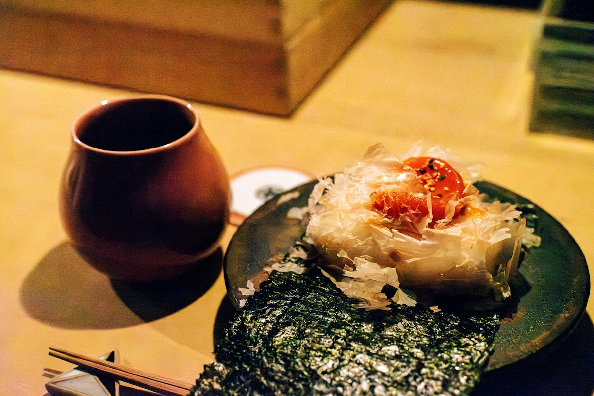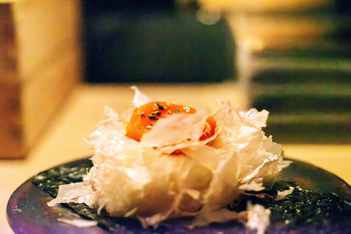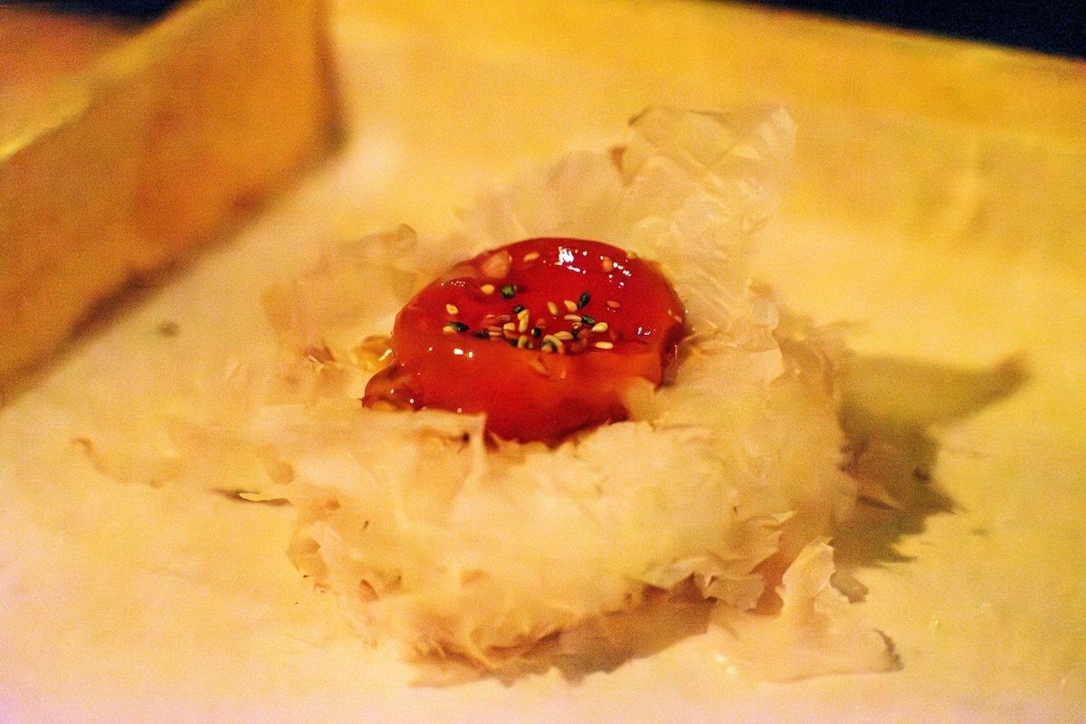 凍らせてうま味とテクスチャーを濃厚にした卵黄と山椒を振って、