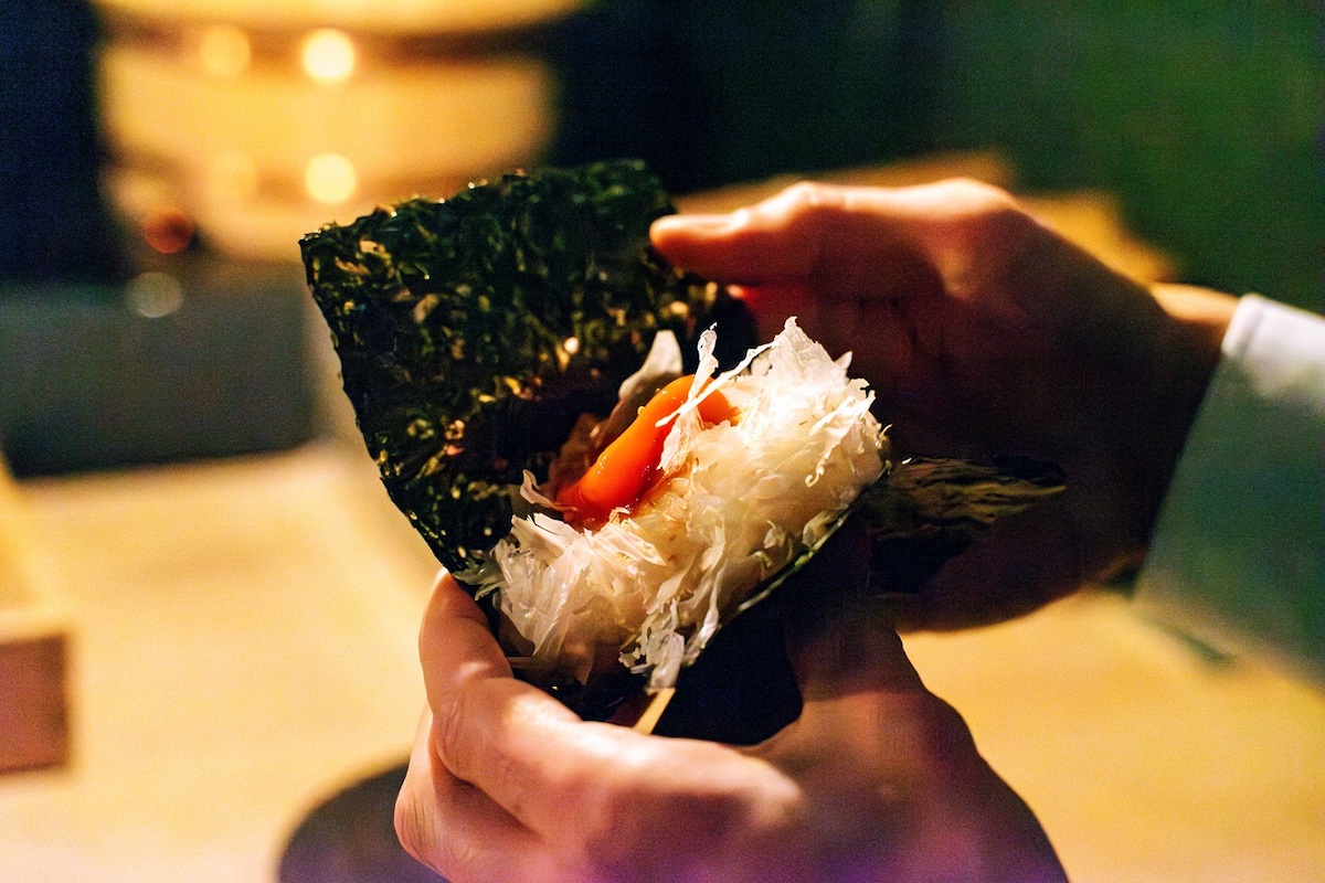 出来上がり! こちらは「卵黄 醤油漬け」650円のおにぎりです。