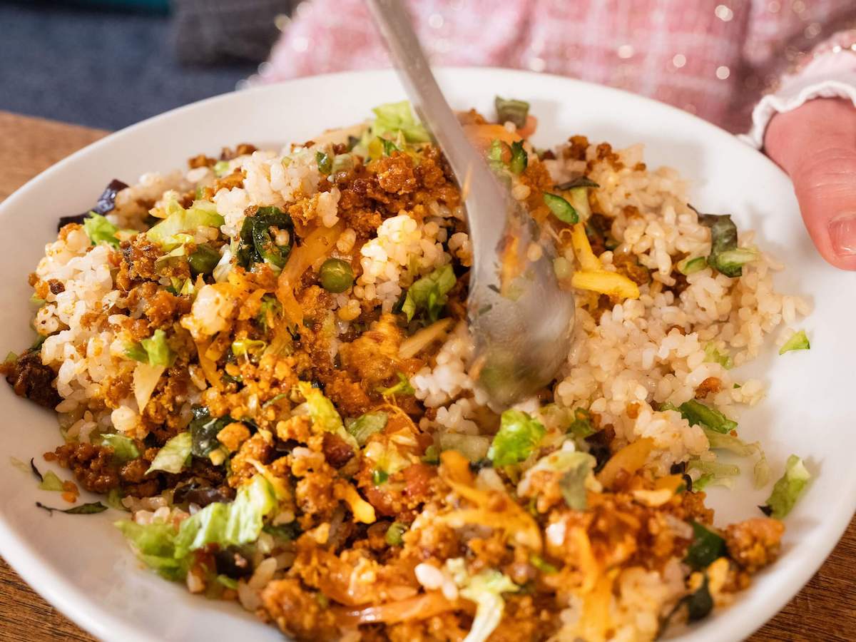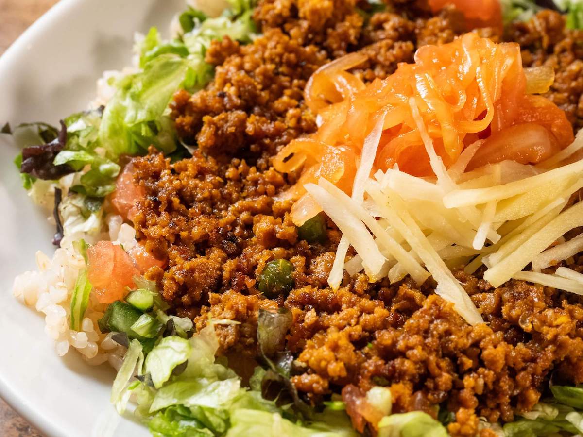 ドライキーマの下にはレタスやカットトマト、そして3分づきの玄米が敷かれており、サラダ感覚で楽しめるのもうれしいところ。
