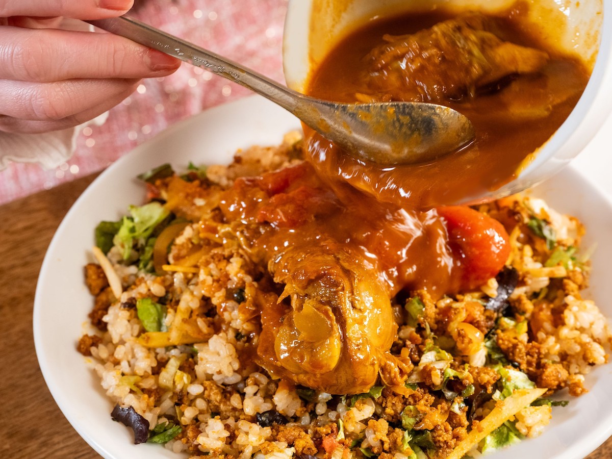 先ほど同様、こちらもまぜまぜして食べるのが鉄則♪ 盛り付けを崩すことに抵抗がある人も、ぜひ一度お店おすすめの食べ方に挑戦してみてください。キーマ、玄米、チキンなどの異なる食感が、口の中でシェアされる驚きを体感あれ!
