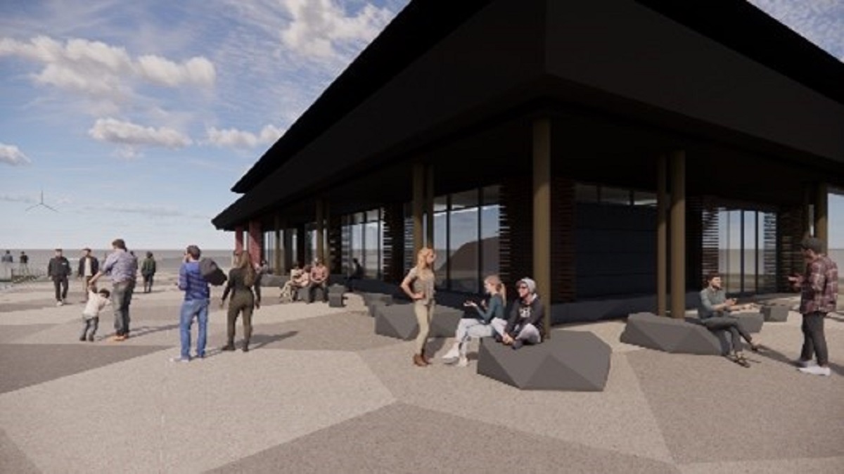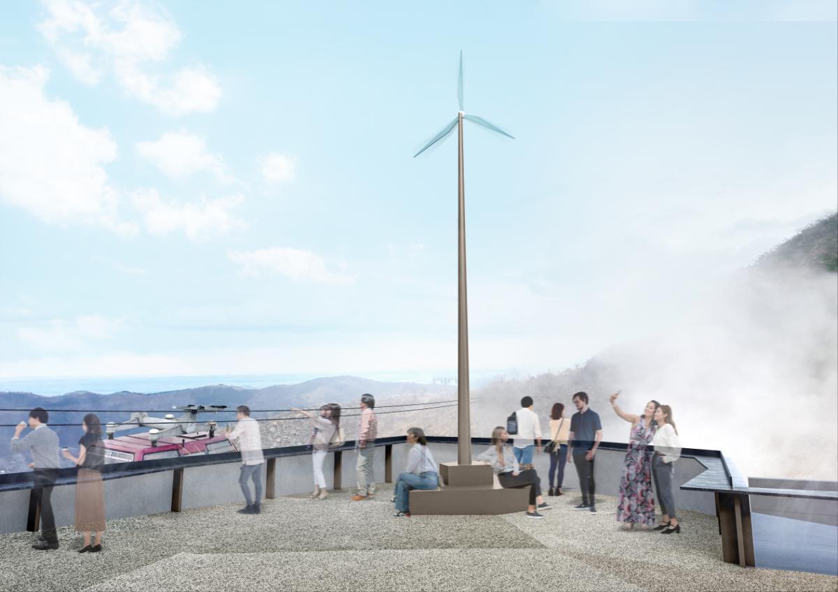 「大空のほとり」は相模湾や都心のビル群まで遠望できる開放感あふれる展望デッキ。すぐ横をロープウェイが走り、ロープウェイと眼下の景色が一緒に撮れるフォトスポットでもあります。風力発電機や火山カメラの周囲にはスタンディングカウンターが設置され、ショップで購入したドリンクやフードでひと休みもできますよ。