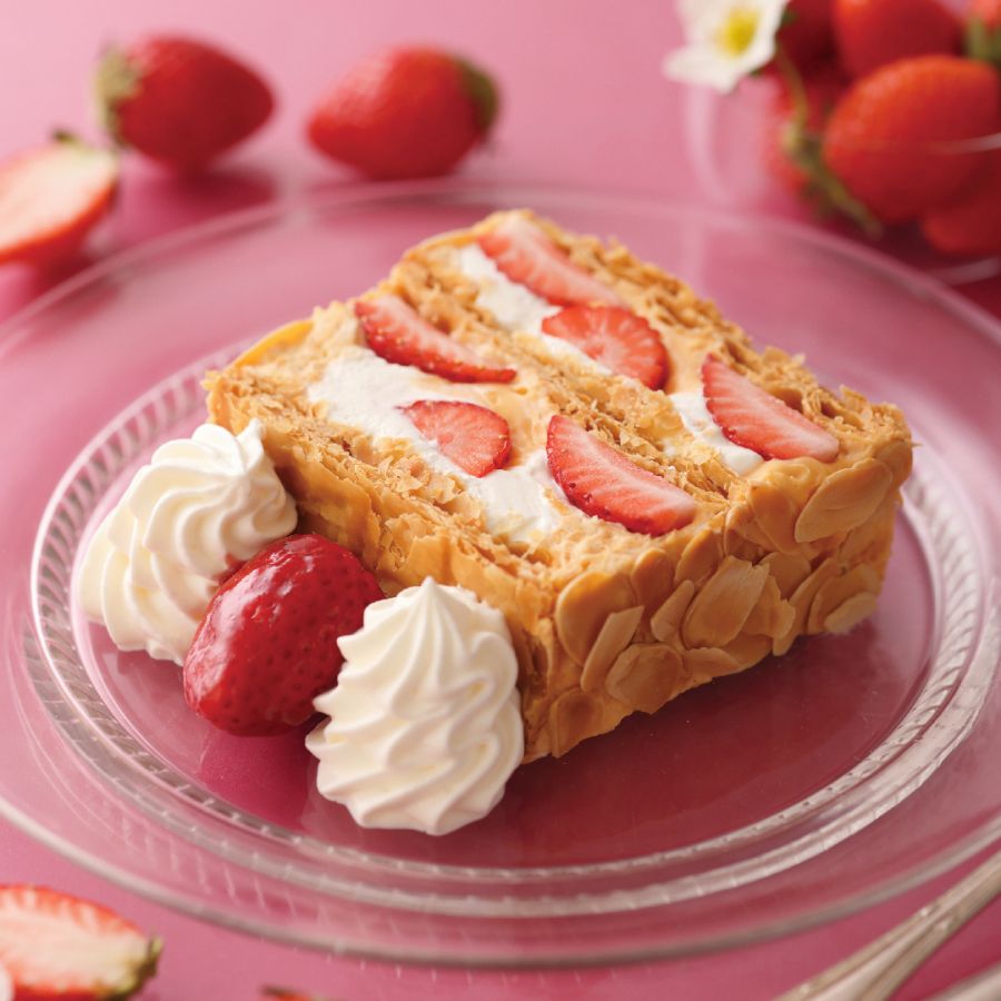 キハチ定番のナポレオンパイ。サクサクのパイ生地で、イチゴとクレーム・シャンティ、ディプロマットクリームを重ね合わせることで生まれる酸味と甘み、パイ生地の食感による絶妙なバランスが特徴です。