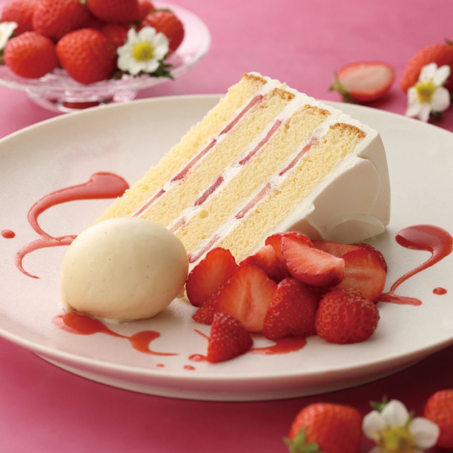 甘ずっぱくておいしい国産イチゴを、生クリームとスポンジでサンドしたシンプルなショートケーキ。バニラアイスを添えて提供されます。