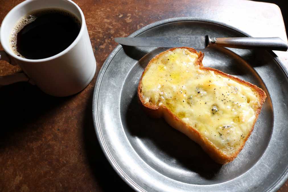 とろとろの蜂蜜がチーズのうえで輝くハニーチーズトースト400円。食パンもチーズも蜂蜜も飽きるほど食べ比べて選んだ逸品の組み合わせ。ケーキで例えるならタルトのような食感のしっかりしたパンは下鴨神社のふもとにある「ナカガワ小麦店」のもの、乗せて焼くチーズも1種類ではなく数種類の組み合わせ。舌が忘れられなくなる味です。