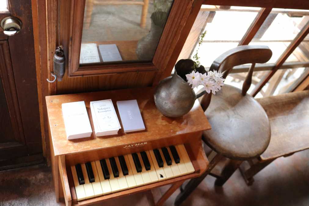 扉をあけてすぐの場所。ショップカードが飾られる小さなピアノが可愛い。