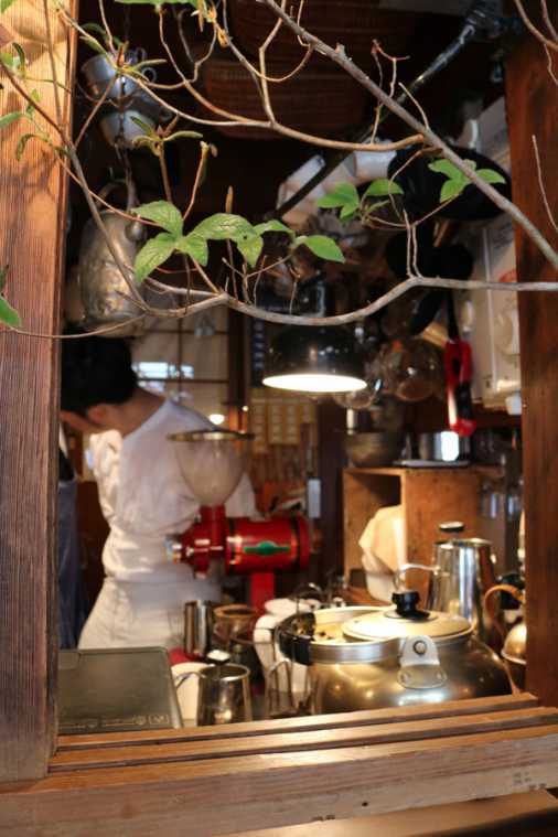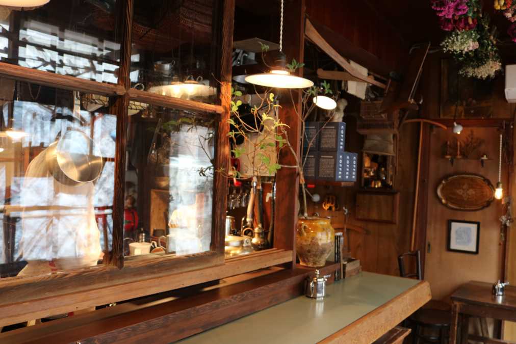 カウンター4席、2人がけのテーブルが2つ。窓ガラス越しに、珈琲を一杯ずつ丁寧にドリップする姿が見られます。壁面や天井、足元にアンティークなモノたちがそっとひそんでいます。