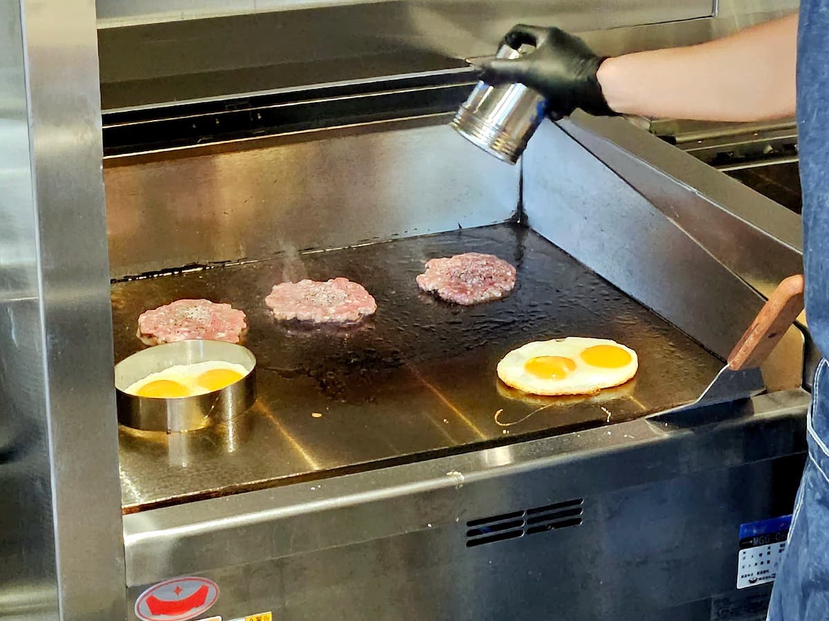 奥の鉄板では、なんとハンバーグと目玉焼が焼かれているではないですか!