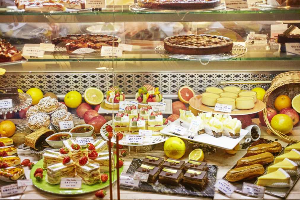 「オ・グルニエドール」のショーケースには、旬のフルーツを使ったタルト類が豊富に並んでいます。取材時には、りんごのタルトやミルフィーユ、日向夏のタルトなどがずらり。