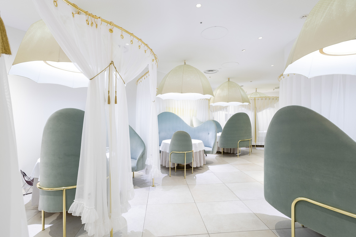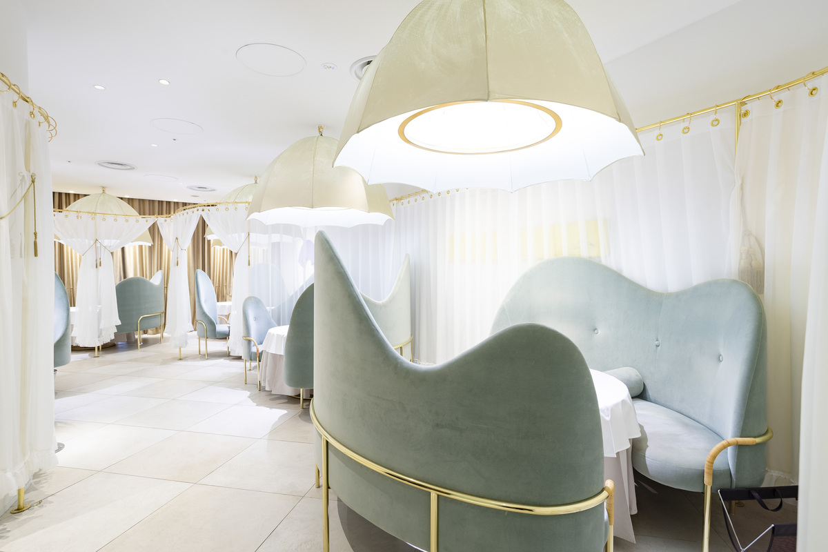 店内には、自然光が明るく差し込み、白のカーテンで仕切られたエレガントな空間が広がっています。