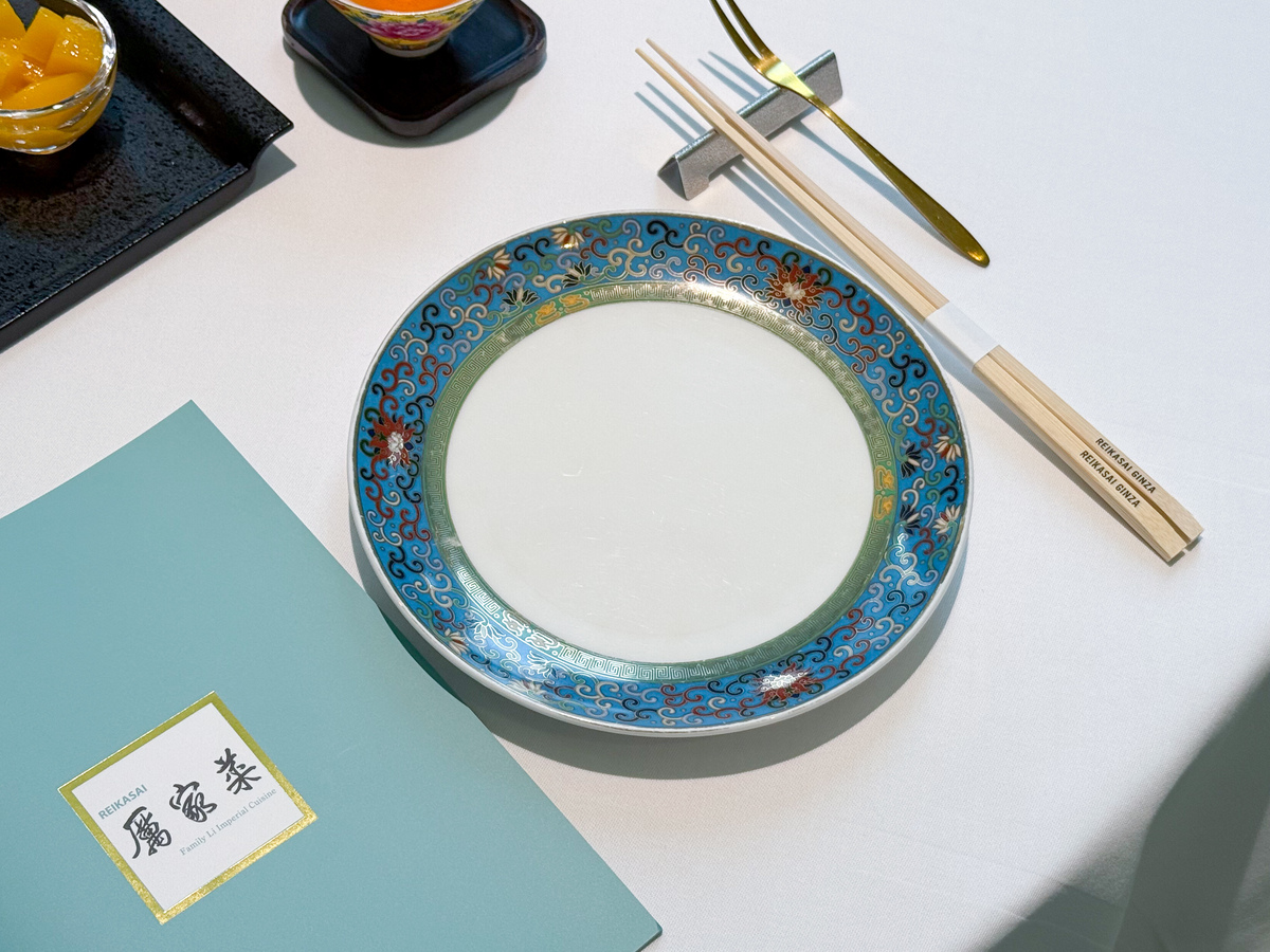 セッティングされる取り皿は中国のもので、ビビッドな色合いや豪華なデザインにうっとり。箸には店名ロゴが入っていて、細部までこだわりが詰まっています。